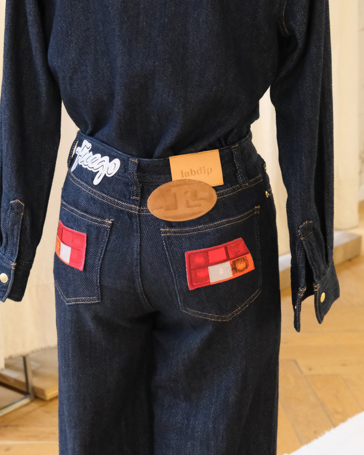 DRIFT JEANS DARK BLUE, le jean Suffren de Labdip, customisé par Maison J.Simone. Sa coupe droite et longue s’impose en denim 3D signature, transformant une coupe intemporelle en pièce de rodéo urbain.