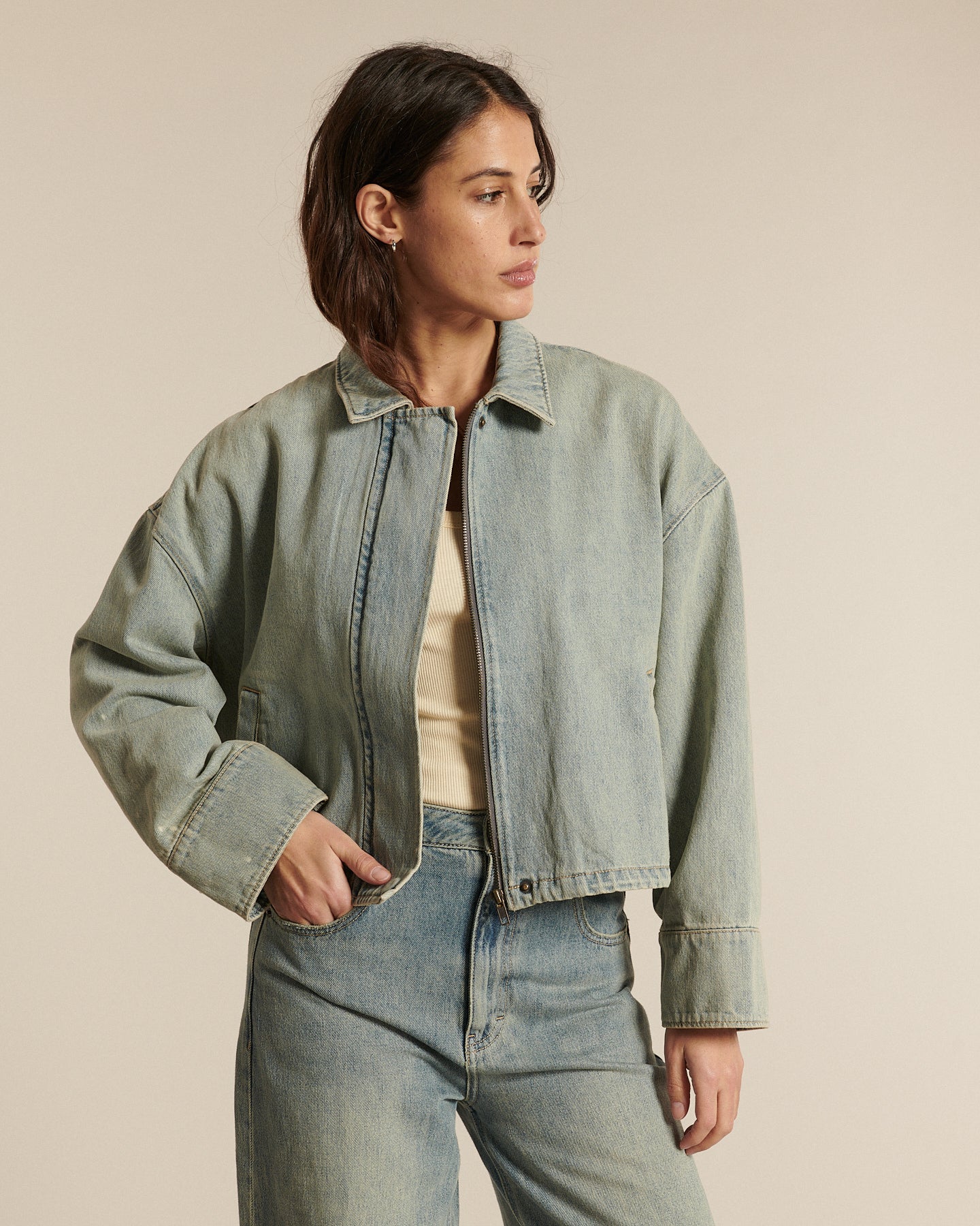 BAKER, la veste courte en jean d'inspiration bombers pour une allure très contemporaine.